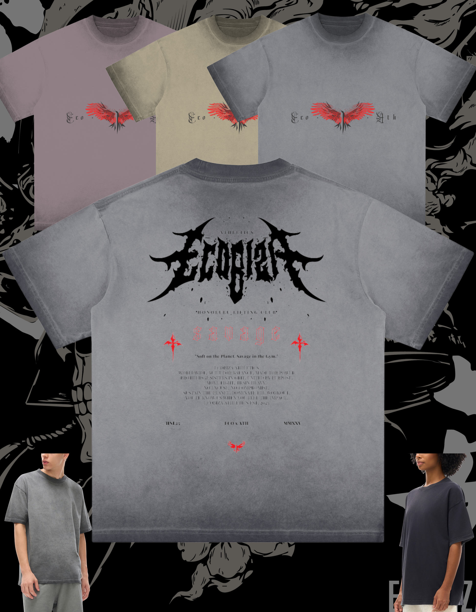 Crafted from 250g 100% cotton, it delivers a breathable yet structured fit that drapes off the shoulders and highlights your build. The washed, reverse-dye finish gives each piece a unique, rugged edge—no two are the same. Designed with a drop shoulder cut, loose fit, and O-neck collar, it’s the kind of shirt that looks as mean as your deadlift.
