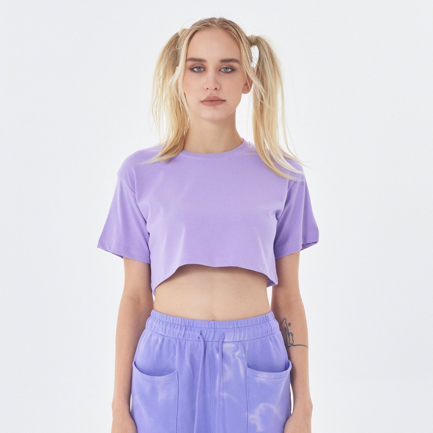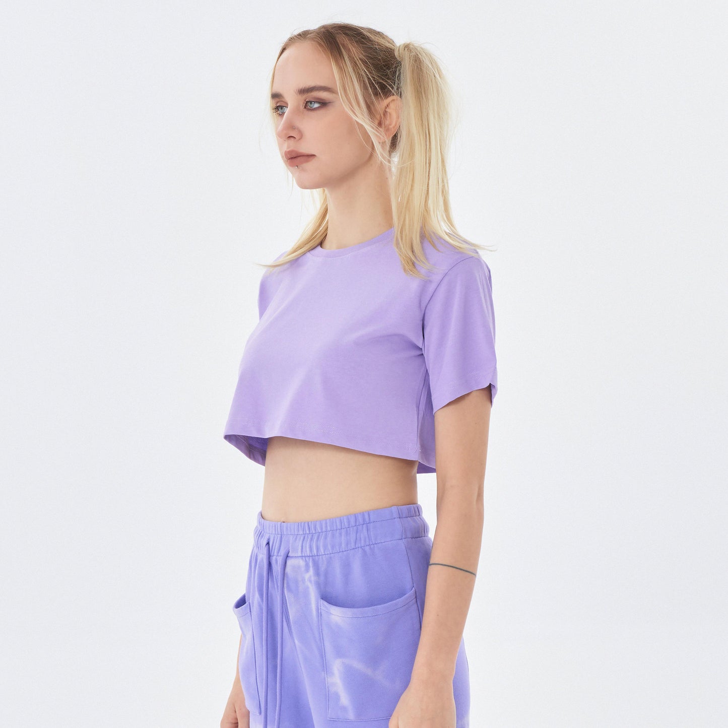 This elevated cropped tee is where everyday comfort meets runway confidence. Crafted from ultra-soft 100% cotton, its midriff-baring cut and gently boxy silhouette create a flattering, feminine frame — effortlessly modern and endlessly wearable. The real showstopper? Its rich, radiant colors, designed to turn heads and light up any room (or studio).